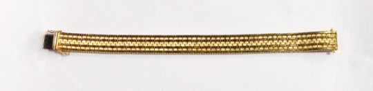A 18ct gold flexible bracelet, bark-finish rows of links with herringbone borders, 48g approx.