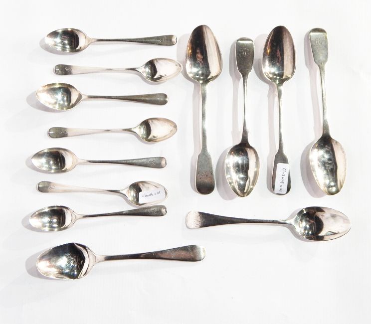 Four early 19th century silver fiddle pattern teaspoons, two Old English pattern teaspoons and seven rat tail pattern silver coffee spoons, 7oz approx.