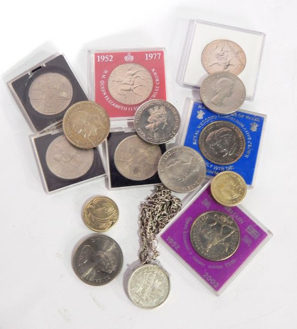 1946 half crown in pendant mount, sundry crowns and coins