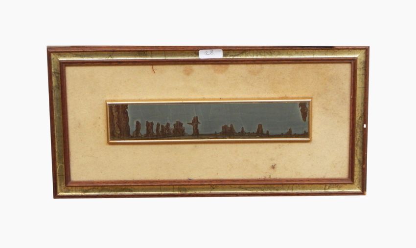 Framed hardstone panel of fossilised remains in landscape, 4cm x 22cm