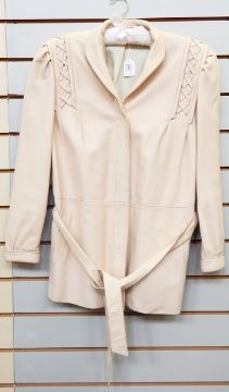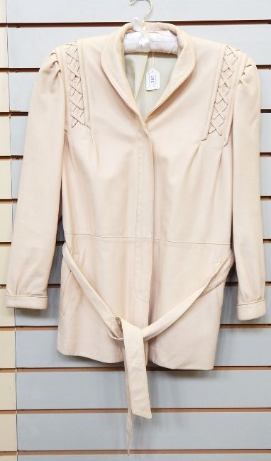 A vintage cream leather jacket with plaited detail to the shoulders and a tie belt, a 1970's green suede and green leather coat labelled "Exmoor Sheepskin Shops" and a black leather lady's coat with tie belt (3)
