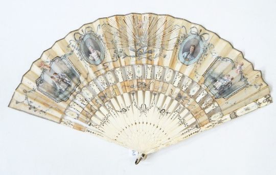 19th Century silver inlaid ivory and painted silk fan decorated with panels of figures, floral swags (af)