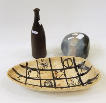 20th century stoneware decorated glazed sculpture in triangular form, incised monogram "JHC", 10cm high, 20th century ceramic vase with tapering body and black mottled glaze (af), 23cm high and 20th century ceramic dish in spearhead form, painted with trelliswork of animals in trees, 34cm diameter