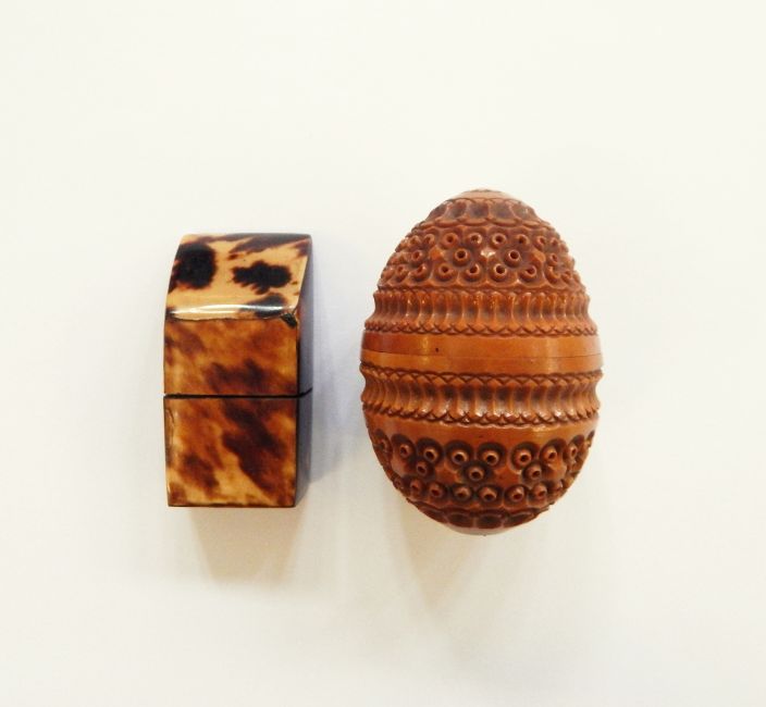 A wooden carved walnut thimble case and a faux-tortoiseshell needlecase (2)