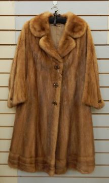 A 1960's mink coat with gilt and leather buttons, bell sleeves, a half belt to the back, made by "Rodgers, Bridlington & York" with embroidered lining