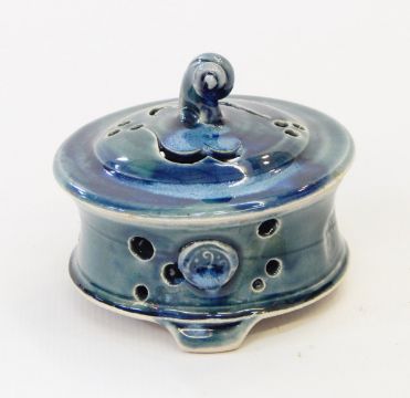 John Bryce-Kershaw (b.1972) Studio pottery pot-pourri lidded vessel of circular waisted form with scroll lid and applied rondels to side, on three bracket-type feet, greeny/blue glaze, impressed monogram, 12cm diameter together with a lidded pot with sgraffito and mottled painted decoration, incised "YP or DH" to base, 14cm diameter (2)
