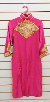 A Chinese silk wedding quipao and trousers (Phoenix and dragon), a pair of black silk opera boots, a pair of embroidered slippers and two pink tassels (1 box)