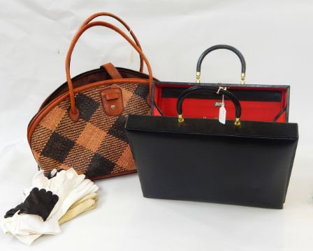 A nylon Prada across body bag with three small sections with zips, a vintage black leather bags, other bags, a black vanity case and various kid gloves (1 box)