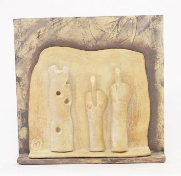 John Maltby (b.1936) Studio stoneware composition stylised abstract of man and woman beside rock pierced with holes, all moulded against backdrop and supported on textured painted wooden panel, stone-coloured glaze, impressed monogram, entitled on reverse "John Maltby, Two Figures and a Rock 2010", 25cm x 26cm overall John Maltby born in Cleethorpes, Lincolnshire 1936 studied Goldsmiths College, London. After a brief spell teaching went to work with David Leach at Bovey Travey from 1962 to 64 after which he set up his own workshop in Devon. His work can be seen in numerous public collections. His work can be characterised by the use of oxidised stoneware and enamel glazes.