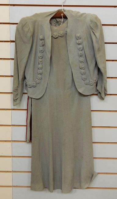 A 1940's moss grey crepe dress with matching bolero style jacket and belt, a light woollen 1940's red dress with flower buttons, a linen dress with puff sleeves, square collar and blue rickrack detail (3)