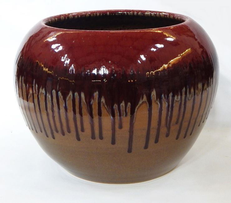 Contemporary Thai stoneware jardiniere, with inverted rim, decorated with red flambeau drip border over brown glazed body