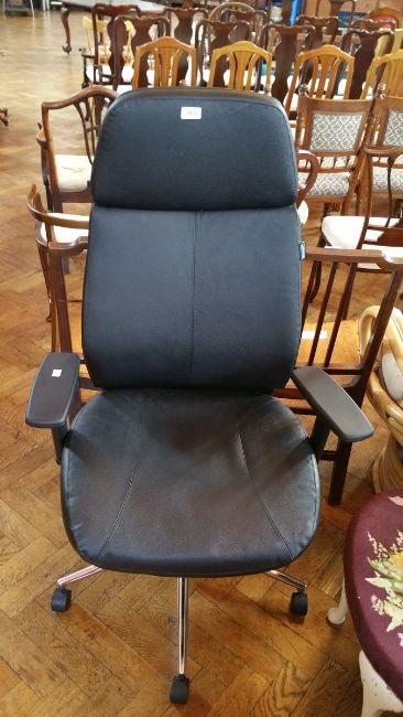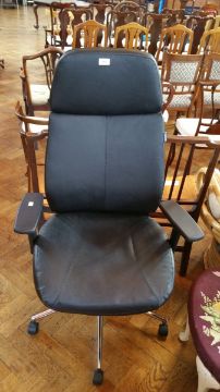 A black vinyl upholstered swivel computer chair on chrome stand and on castors