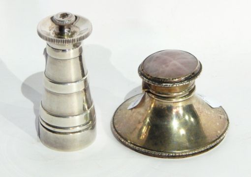 A silver inkwell, Birmingham 1912 by Levy & Salaman, of circular form, the hinged cover set with rose quartz and a silver plated pepper mill of banded form