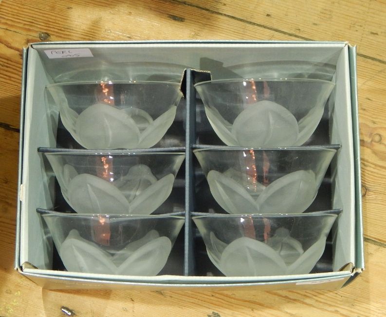 A set of six Florence Satine dessert bowls with frosted leaf pattern together with a matching serving bowl and a circular spiral enamel design dish