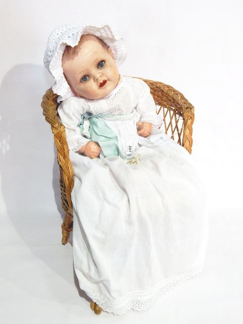 Early 20th century German composition doll, blue sleep-eyes, open mouth, soft body with composition arms and legs, 48cm long together with canework tub chair