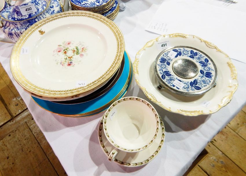 A selection of 19th century and later dessert plates including a Copeland example painted with flowers and a Ducal crest, a comport, teacup and saucer, etc.