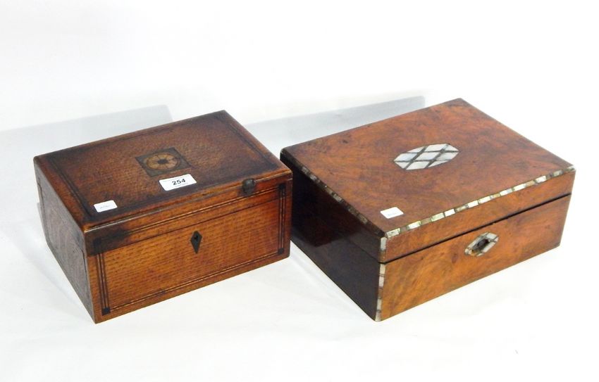 An oak jewellery box and a walnut writing box with mother-of-pearl inlay