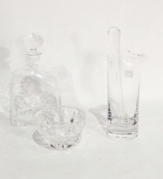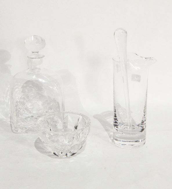 Cylindrical glass mixer jug and stirrer, rectangular cut glass decanter and stopper, etc.