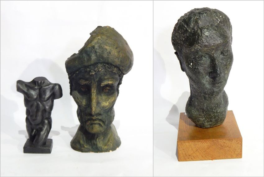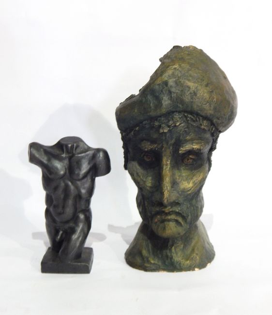 A plaster sculpture of a woman's head on wooden plinth, 43cm, another of a gentleman and a sculpture of a male torso