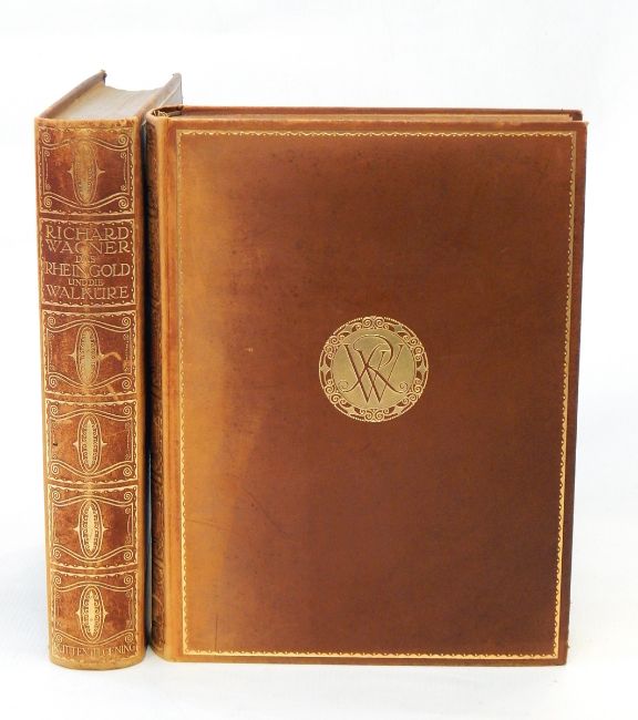 Wagner, Richard; Rackham, Arthur (illus.) Der Ring des Nibelungen - Das Rheingold et die Walkeure / Siegfried et Gotterdammerung, Rütten & Loening, 1910 & 1911 (2 vols), both vols tipped in colour plates, tissue guards, text in German, uniformly bound, full brown calf, gilt rules and gilt insignia to front bds, gilt titles to backstrip, some fading and some slight water damage to vol 1 (2 vols)