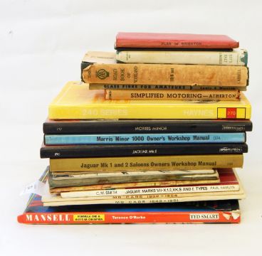 Various car manuals including: MG cars 1952-54, MG cars 1948-51, Jaguar MKI and II saloons 1955-69, Jaguar MKII 1957-67, Morris Minor 1000 1956-71, Jaguar MK8 to MK10, 1, 2 XK, S and E types, Jaguar 3.8l MKII model, two paperback books published by Castrol, "Achievements 1960" and "Achievements 1956" and either other volumes (20)