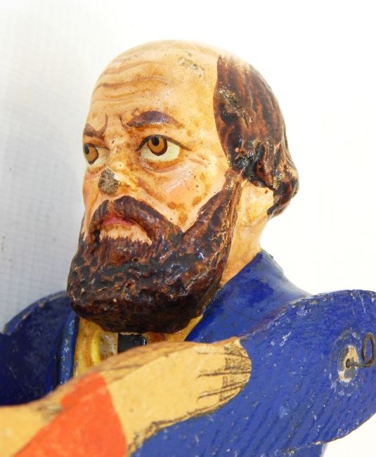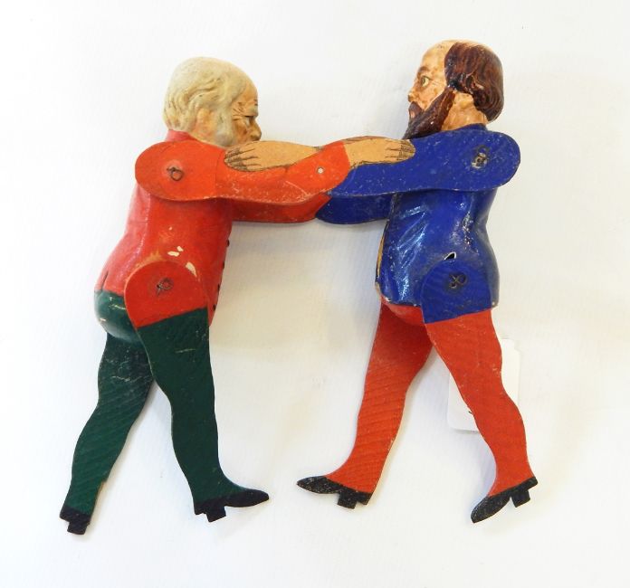 A Victorian political puppet of Gladstone & Disraeli facing one another, painted in bright colours