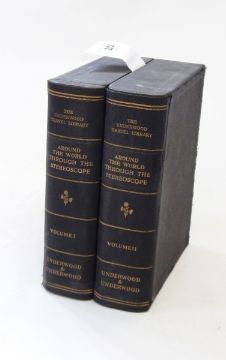 A quantity of photographic stereoscope slides from The Underwood Travel Library, 'Around the World through the Stereoscope', bound faux book presentation by Underwood & Underwood