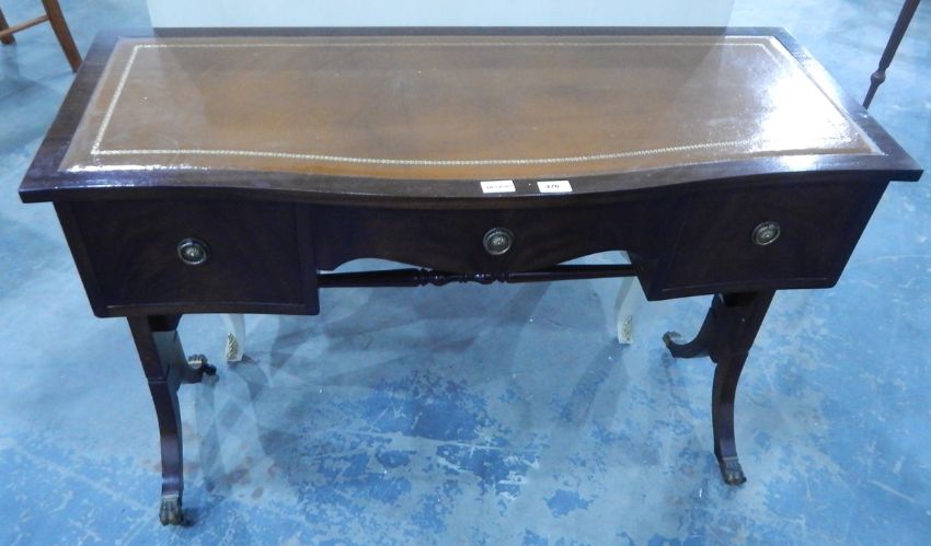 A reproduction mahogany serpentine-fronted writing table, the top with tooled leather inset, on straight standard swept feet and brass hare claw toes