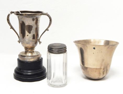 A silver backed dressing table set comprising two brushes, a hand mirror and a comb, a silver two-handled trophy and other items