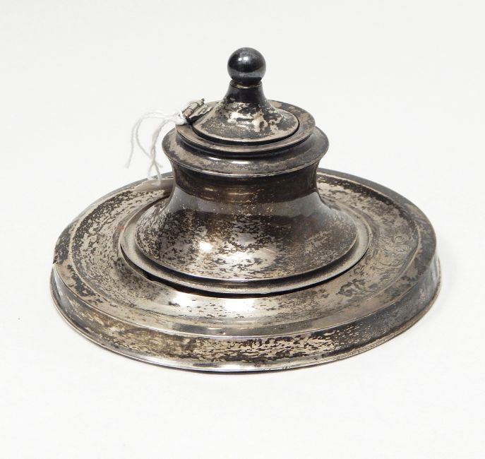 A capstan inkwell, Chester (date letter rubbed) of circular form with hinged cover