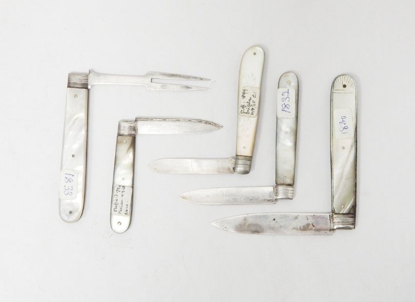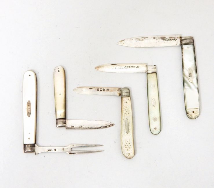 A Victorian silver fruit knife with mother-of-pearl handle, metal insert and decoration, Sheffield 1899, maker William Nowell together with four others (5)