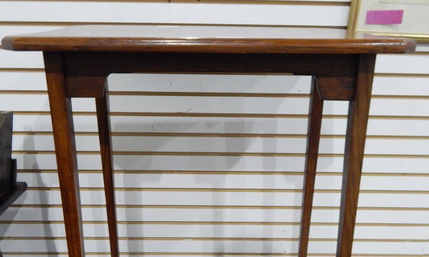 A dwarf mahogany cabinet, an oak occasional table, a frameless bevelled mirror with cut decoration and a small frameless mirror (4)