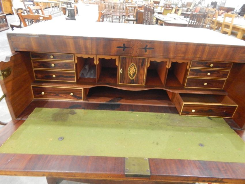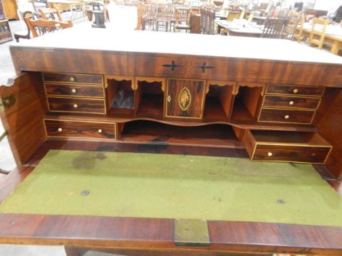 An early 19th century cross banded and inlaid mahogany straight front secretaire with fitted interior with pigeonholes, small drawers over three graduated long drawers, each with turned knob handles, shaped apron and bracket feet, 106cm wide