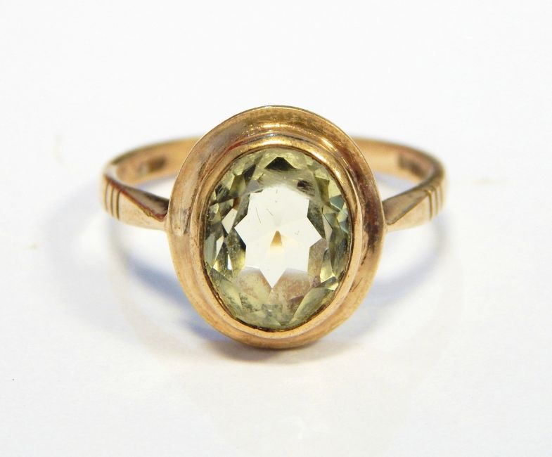 9ct gold and pale green stone solitaire ring, collet set oval facet-cut stone