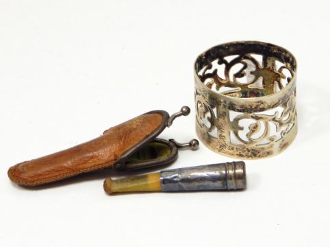 A set of six silver teaspoons in fitted case, a silver mounted cheroot holder and a napkin ring