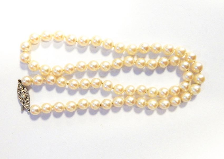 A uniform row of cultured pearls with a paste set clasp