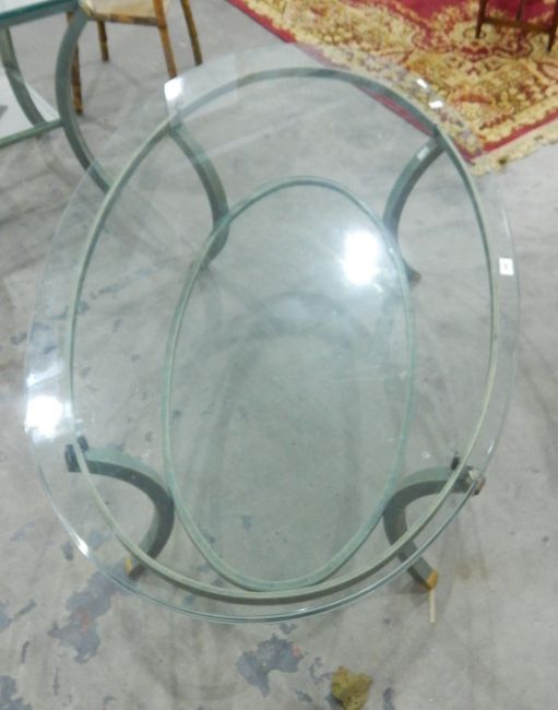 An oval metal framed glass topped two-tier conservatory table, 135cm x 81cm