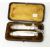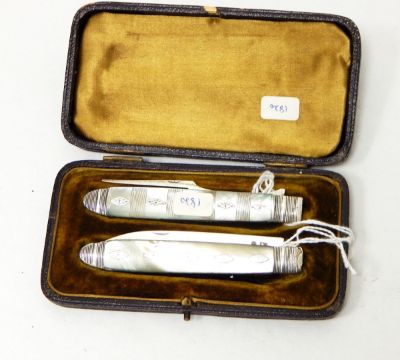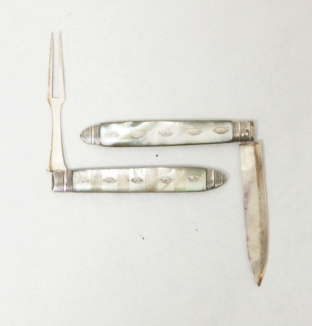 A Georgian silver knife and folding fork set with mother-of-pearl handles, insert metal decorations, marked indistinctly, cased