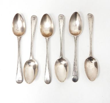A set of five George III bead pattern dessert spoons, London 1783, by George Smith, crested and one to match by a different maker, 7g approx.