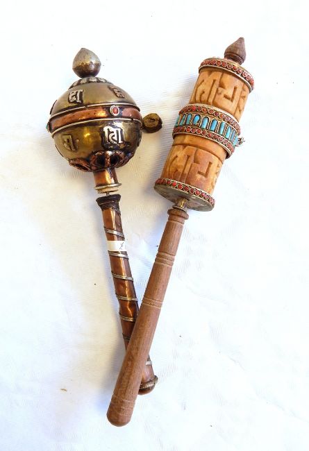Two prayer wheels, carved stone model of Rama and Sita (af), pair metal folding scales in decorated papier mache box (possibly Indian) and a carved elephant model (5)