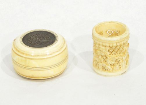 Four small Oriental ivory figures, white metal mounted ivory trinket box and pierced ivory part box
