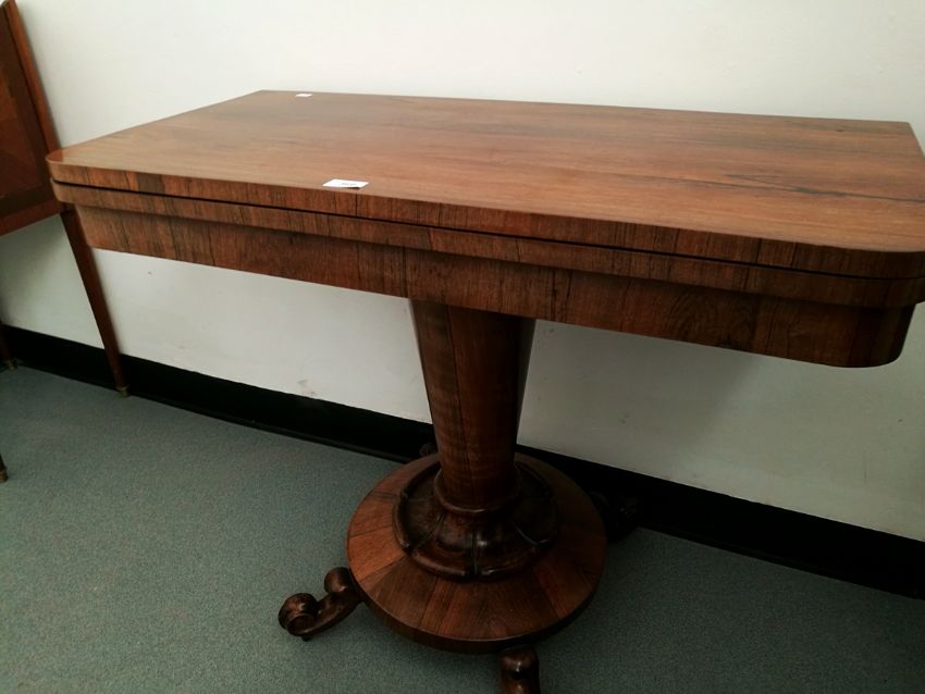 A mahogany rotating top card table with circular base inset, on circular tapering column, on scroll and castor feet, 92cm wide