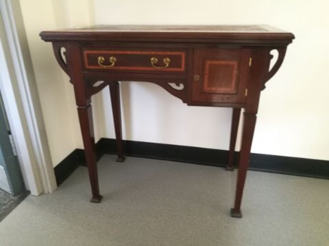 Edwardian lady's inlaid writing table with leather inset top, frieze drawer and side cupboard on square tapering legs, 84cm wide