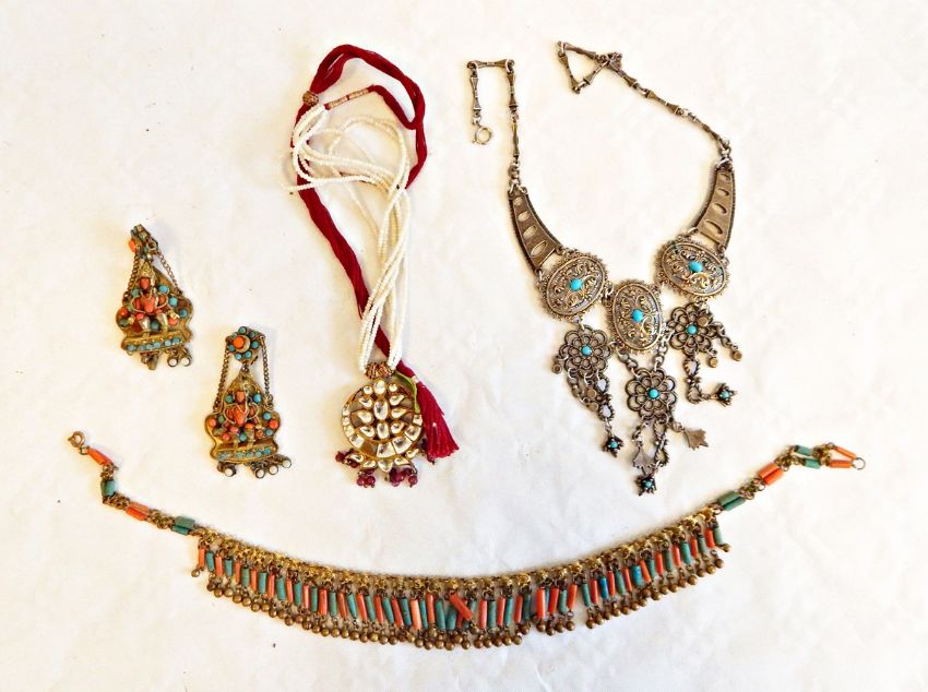An Indian metal, jade and turquoise necklace and earrings, similar white metal and turquoise necklace and an Indian bead mirrored glass and ruby red bead necklace