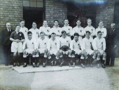 Photograph of cricket team with cup, signed in margin, framed, photograph of Keble College Rugby 15 1951-1952, framed, photograph of a rugby team, framed and a wooden picture frame lacking glass and another item