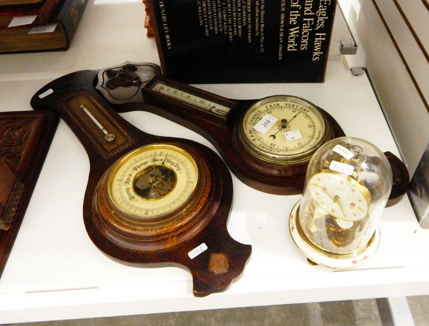 Two stained wood aneroid barometers and a Schatz perpetual timepiece