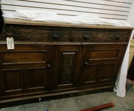 A 19th century oak sideboard with two long frieze drawers, cupboard below, floral scroll carving, on square block feet, 156cm wide
