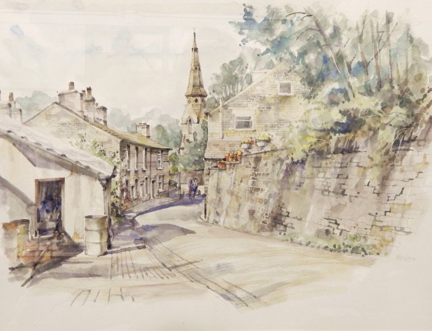 After W Moseley Colour printsA high street and a village scene with church in the middle groundModern oil Country lane (3)