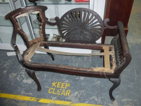 An Edwardian mahogany settee, the show frame with central pierced and carved oval scroll arms, on cabriole legs (lacking upholstery)