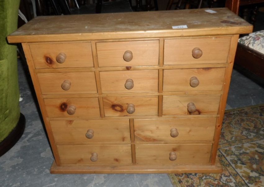 A pine chest of 13 short drawers together with a cast iron fireback depicting a flower with monogram "MM" and two chairs